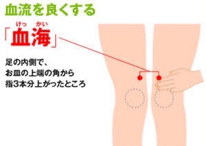 血海というツボは膝の骨内側の指三本上です。血流を促しアンチエイジングに効果を発揮します!!!